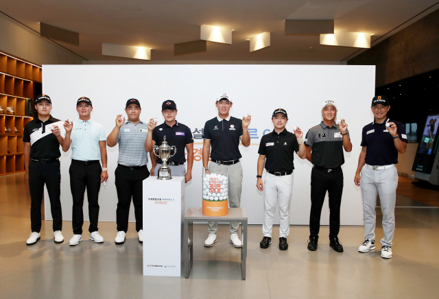 우성종합건설이 경남 창원 아라미르 골프 앤 리조트에서 개최하는 남자프로골프(KPGA) 투어 ‘우성종합건설 아라미르CC 부산경남오픈(총상금 5억 원·우승상금 1억 원)’이 8일 개막됐다. 11일까지 열리는 이번 대회에 참가한 국내 정상급 스타선수들이 개막에 앞서 선전을 다짐하고 있다. 왼쪽부터 강태영, 엄재웅, 김주형, 이재경, 이지훈, 최민철, 허인회, 문경준. KPGA제공