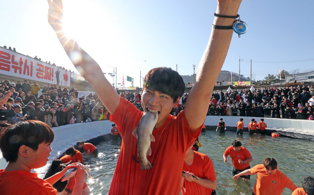화천군 산천어축제에서 열린 맨손잡기 체험에 참가한 관광객이 산천어를 입에 물고 환호하고 있다. 연합뉴스