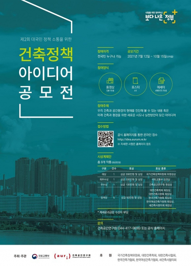 이번 공모전은 우리나라 건축과 공간환경의 현재를 진단해볼 수 있는 내용 혹은 미래 건축과 환경을 위한 새로운 시도나 실천방안을 주제로 아이디어를 모집하고 우수한 아이디어는 실제 건축정책에 반영할 계획이다.