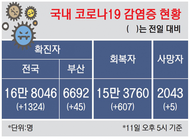 중앙방역대책본부는 11일 0시 기준으로 신규 확진자가 1324명 늘어 누적 환자는 16만 8046명이라고 밝혔다. 이로써 국내 하루 확진 규모는 사흘째 1300명대를 이어갔다. 특히 주말 기준으로는 이날 신규 확진자가 역대 최다다. 종전 최다 기록은 지난해 12월 20일 1097명이었다. 또 비수도권의 지역발생 확진자가 사흘 연속 전체의 20%를 넘으면서 확산세가 비수도권으로까지 본격적으로 퍼지고 있다는 분석도 나온다. 11일도 오후 6시까지 921명이어서 6일 연속으로 1000명을 넘을 것으로 예상된다.