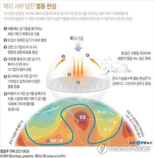기상 전문가들은 이런 폭염의 원인으로 대형 ‘열돔’ 현상을 지목한다. 열돔은 지상 5~7㎞ 상공에서 발달한 고기압이 정체된 상태에서 돔이나 뚜껑 형태의 열 막을 형성하면서 뜨거운 공기를 지면에 가둬 놓는 기상현상을 말한다. 이 현상이 생기면 예년보다 5~10도 이상 기온이 올라간다.