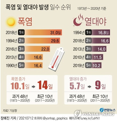 폭염 발생과 열대야 일수도 이전과 비교해 많이 증가했다. 기상청 기후정보포털이 공개한 최근 10년(2011~2020년)간 우리나라 폭염과 열대야 경향을 분석한 결과에 따르면, 폭염 일수가 과거 48년(1973~2020년) 평균보다 최근 10년간 나흘가량 늘어나 14.0일을 기록했다. 열대야 일수는 사흘 남짓 증가해 9.0일로 나타났다. 연대별 폭염·열대야 발생 일수를 살펴보면 1970년대(8.3일·4.2일), 1980년대(9.7일·4.2일), 1990년대(9.6일·5.8일), 2000년대(9.2일·5.1일), 2010년대(14.0일·9.0일)로 최근 10년은 발생 빈도가 크게 상승하는 경향을 보였다.
