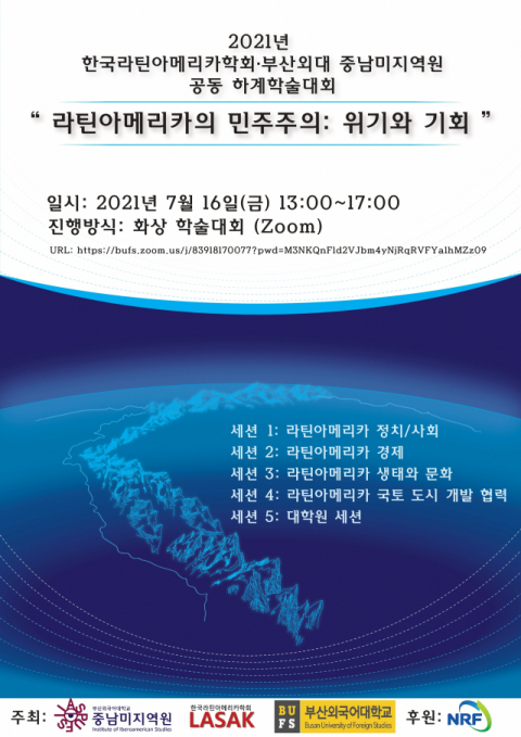 부산외국어대학교 중남미지역원(원장 임상래)은 오는 16일 한국라틴아메리카학회와 ‘라틴아메리카의 민주주의 : 위기와 기회’라는 주제로 온라인 학술대회를 개최한다고 14일 밝혔다.
