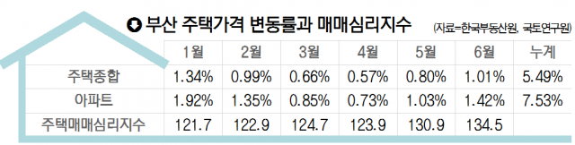 6월 부산의 주택(아파트·단독·연립) 종합가격이 전월보다 1.01%가 올랐다. 이는 전국에서 인천(1.46%) 경기(1.32%) 다음으로 높은 것으로, 비수도권에서는 가장 많이 오른 것이다.
