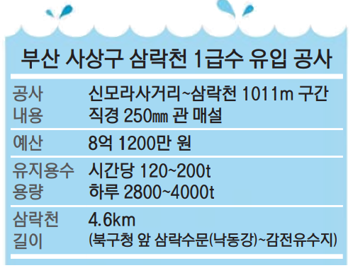 부산 사상구청은 지난해 6월 시작한 ‘백양산 운수천 1급수 삼락천 유입공사’를 올 3월 완료했다고 19일 밝혔다. 사상구청은 시비 8억 1200만 원을 투입해 신모라사거리에서 삼락천에 이르는 1011m 구간에 지름 250mm 배관을 매설했다. 배관을 통해 1km 이상 끌어온 백양산 운수천 물이 삼락천으로 시간당 120~200t, 하루 2800~4000t 씩 들어온다.
