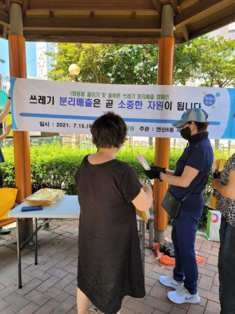 연제구 연산6동(동장 최현욱)은 지난 15일 직원 및 새마을문고회원과 함께 새싹공원에서 올바른 생활쓰레기 분리배출 방법 및 1회용품 줄이기 홍보 캠페인을 실시하고 자원재활용 홍보용으로 동에서 자체 제작한 다회용 장바구니를 배부했다.