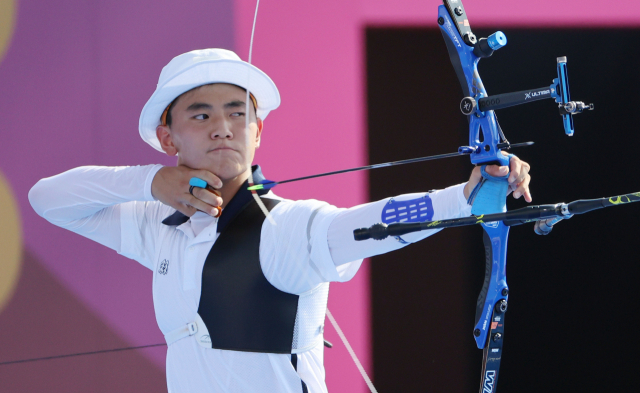 양궁 국가대표 김제덕이 24일 일본 도쿄 유메노시마 공원 양궁장에서 열린 도쿄올림픽 혼성 단체전 준결승전 멕시코와의 경기에서 활시위를 당기고 있다. 연합뉴스