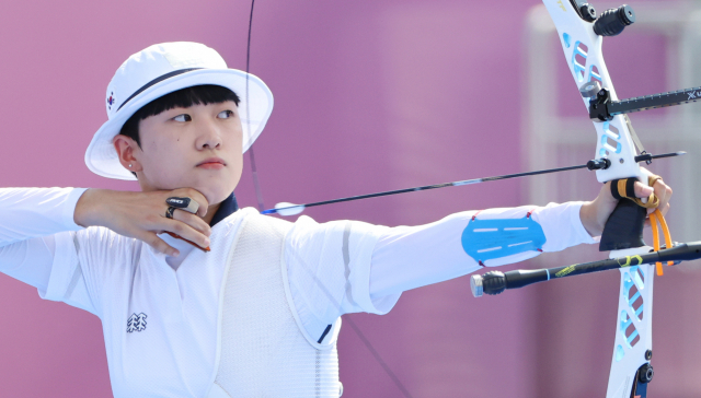 양궁 국가대표 안산이 24일 일본 도쿄 유메노시마 공원 양궁장에서 열린 도쿄올림픽 혼성 단체전 8강 인도와의 경기에서 화살을 쏘고 있다. 연합뉴스