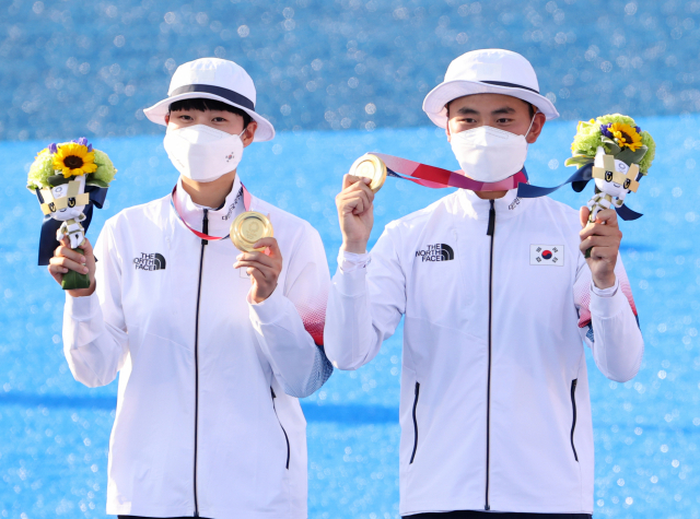 24일 일본 도쿄 유메노시마 공원 양궁장에서 열린 도쿄올림픽 양궁 혼성 결승전에서 금메달을 획득한 양궁 국가대표 김제덕과 안산이 금메달을 목에 걸고 포즈를 취하고 있다.