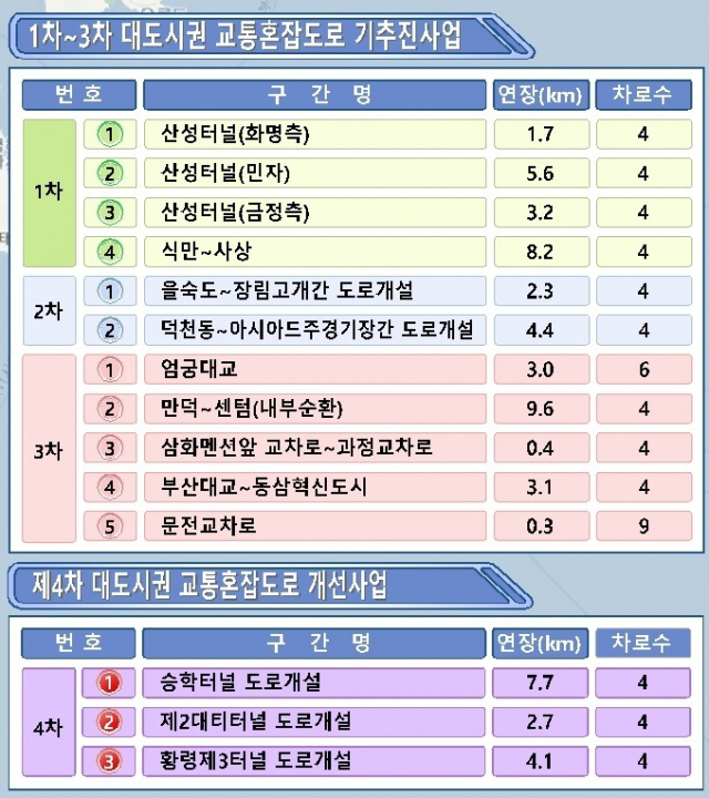 부산의 경우 북항에서 서쪽방향으로 터널을 신설하는 사업인 승학터널(7.7km)과 제2대티터널(2.7km) 도로개설 사업이 뽑혔다. 또 지리적 여건으로 우회하고 있는 연제구와 남구를 바로 잇는 터널인 황령제3터널(4.1km)을 개설한다.