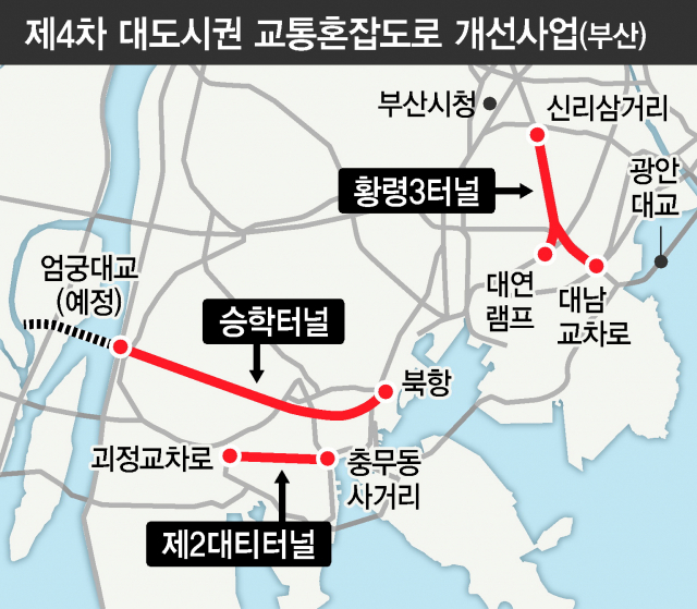 부산의 황령3터널과 승학터널, 제2대티터널이 도심의 만성 교통체증을 해소하기 위한 정부의 혼잡도로 개선사업에 포함됐다. 이에 따라 대규모 건설비가 투입되는 해당 사업의 설계비와 공사비 50%를 각각 정부로부터 지원받을 수 있게 됐다.