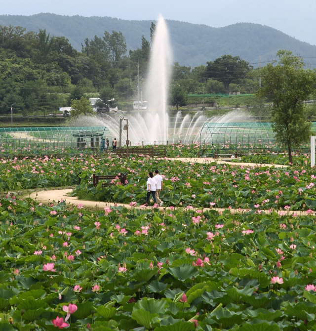 경남 함안군 가야읍에 있는 연꽃테마파크가 코로나19와 폭염으로부터 벗어날 수 있는 야외 여행지로 손꼽히고 있다. 총면적 10만 9800여㎡의 함안 연꽃테마파크에서는 15m 높이의 대형 분수가 여름 열기를 식혀주면서 홍련, 백련, 수련, 가시연까지 다양한 연꽃을 감상할 수 있다. 함안군 제공