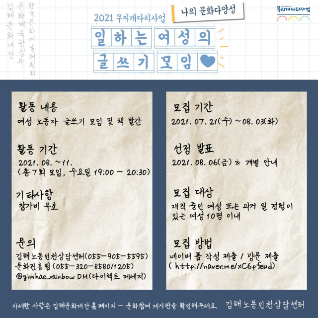 (재)김해문화재단은 2021 무지개다리사업 일환으로 진행하는 ‘나의 문화다양성 사업’의 <여성 노동자 글쓰기 모임> 참여자를 오는 8월 3일(화)까지 모집한다.