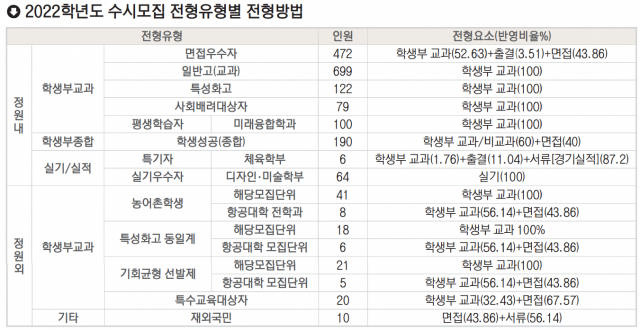 정원 내 학생부교과 유형의 경우 ‘일반고·특성화고·사회배려대상자’ 등은 학생부 교과가 전형에 100% 반영된다. 면접우수자 유형은 학생부 교과(52.63%)·출결(3.51%)·면접(43.86%) 등이 선발 기준이다.