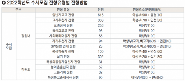 전형 유형별 주요 요소를 살펴보면, 일반계고교 전형은 ‘학생부 90%+출결10%’, 교사추천자 전형은 ‘학생부70%+면접30%’를 반영한다. 실기전형은 ‘학생부 20%+실기80%’를 반영한다. 자기추천자 전형과 소프트웨어(SW) 융합인재 전형은 ‘학생부60%(교과·비교과)+면접40%’를 반영한다. 이와 함께 교과성적 전형과 특성화고교 전형, 사회배려대상자 전형, 정원외인 농어촌출신자 전형과 특성화동일계출신자 전형, 고른기회 전형은 학생부 100%로 합격자를 선발하고 있다.