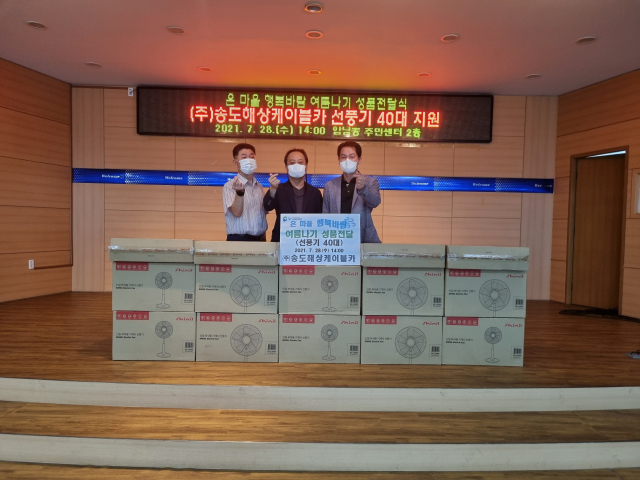 (주)송도해상케이블카(대표 최효섭)는 최근 선풍기 40대를 부산 서구 암남동(동장 최영호)과 동 지역사회보장협의체(위원장 문태건)에 기탁했다.
