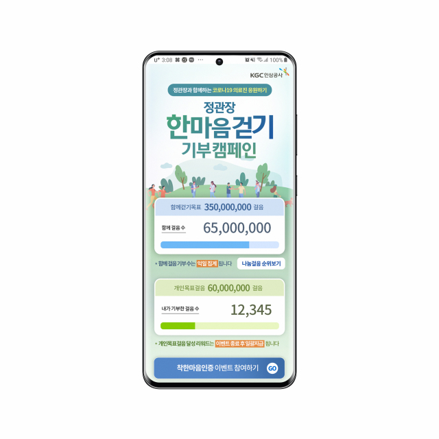 △KGC인삼공사는 무더위 속 코로나19 방역 일선에서 고생하는 의료진들을 응원하기 위해 '정관장 한마음 걷기 기부 캠페인'을 비대면으로 진행한다. 캠페인은 9일부터 22일까지 14일간 진행되며, 참가자의 총 걸음수가 3억 5000만 보 이상을 달성하면 10억 원 상당의 정관장 홍삼제품을 희망브리지 전국재해구호협회를 통해 코로나19 대응지원 의료진에 기부한다. 무더운 날씨에 확진자까지 폭증하면서 격무에 지친 의료진들의 건강을 생각하는 마음으로 홍삼제품을 지원한다. 참가 희망자는 '정관장 케어나우' 앱을 스마트폰에 설치하고 캠페인 참여버튼을 누르면 된다. 함께 모여 걷는 대신 비대면 생활 속 걷기로 누구나 개별적으로 참여할 수 있다. 참가자는 앱을 통해 참여하는 인원과 누적걸음 수 등을 확인할 수 있다. 참가자 전원에게는 정관장 멤버십 2000포인트와 정관장 제품 10만 원 이상 구매시 사용할 수 있는 1만 원 할인쿠폰을 제공하며, 최다걸음 추첨을 통해 '정관장 홍삼톤'을 전달한다.