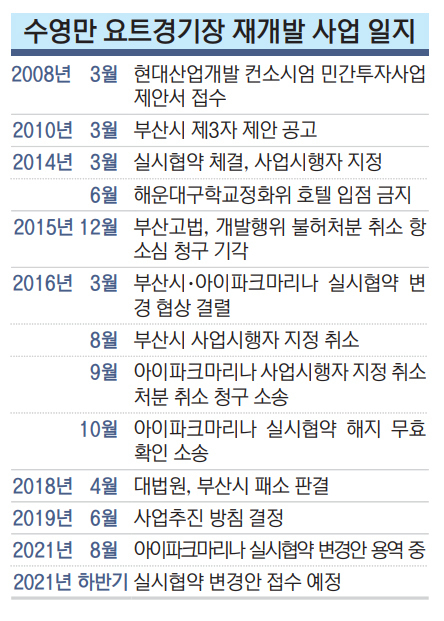 달맞이고개, 해운대해수욕장, 동백섬, 마린시티에 이어 센텀시티로 향하는 중간 지점에 위치한 해운대관광벨트의 핵심 시설인 요트경기장은 1986년 준공됐다. 요트경기장 재개발 사업은 2008년 3월 현대산업개발 컨소시엄이 부산시에 민간투자사업 제안서를 내면서 첫발을 뗐다. 2014년 아이파크마리나가 사업시행자로 지정됐지만 학교정화구역 논란과 주민 반대에다 호텔·컨벤션 시설에 대한 부대사업·부속사업 논란까지 더해지면서 먹구름이 드리워졌다. 호텔·컨벤션 시설이 부속사업이 아닌 부대사업이 되면 기부채납을 조건으로 한 운영 기간이 30년에서 20년으로 줄어 수익성이 크게 떨어지게 된다. 결국 2016년 부산시의 사업자 지정 취소에 따른 행정소송까지 진행되는 등 좌초 위기를 맞았다.