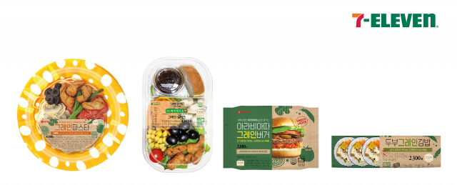 △편의점 세븐일레븐은 늘어나는 채식시장을 겨냥해 '그레인(Grain)'을 콘셉트로 채식 간편식을 선보였다. '그레인 파스타', '그레인 샐러드', '아라비아따 그레인 버거', '두부 그레인 김밥' 등 4종으로 콩, 두부, 양파 등 곡물과 야채를 중심으로 내용물을 구성했다. 그레인 파스타와 그레인 샐러드는 글로벌 식품회사 네슬레에서 만든 식물성 고기 소이너겟을 메인으로 활용했다. 콩 단백질이 주 원료로 고기와 같은 맛과 식감을 살렸다. 그레인 파스타는 토마토 파스타에 소이너겟, 양송이 버섯, 올리브 등을 듬뿍 올려 완성했다. 그레인 샐러드는 소이너겟과 병아리콩, 감자 치아바타, 각종 야채 등을 담았다. 아라비아따 그레인 버거는 곡물, 양파 등 식물성 패티를 사용해 만든 채식 햄버거다. 아라비아따 소스를 넣어 매콤한 맛을 살렸으며 토마토와 양상추를 곁들여 신선한 야채 풍미를 더했다. 두부 그레인 김밥은 고기 대신 두부 튀김을 메인으로 담고 소스도 식물성 재료로만 만든 마요소스와 데리야끼소스를 별도 개발해 사용했다. 마요소스로 버무린 우엉조림과, 당근채, 깻잎 등을 푸짐하게 토핑해 속을 든든하게 채웠다.
