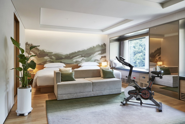 △워커힐 호텔앤리조트가 친환경 호텔 활동의 일환으로 업계 최초 비건 콘셉트 룸인 '비건 전용 객실'을 도입하고, 이를 체험할 수 있는 '비긴 비건(Begin Vegan)' 패키지를 출시한다. 그간 호텔에서 음식이나 어메니티를 앞세운 비건 콘셉트를 선보인 경우는 많았으나, 객실 전반에 걸쳐 비건 인테리어·관련 용품을 도입하며 친환경 비건 트렌드를 총체적으로 경험하도록 하는 경우는 국내 호텔 중 최초다. 워커힐의 비건 전용 객실은 그랜드 워커힐 '패밀리 딜럭스 스위트'3개 객실에 만들어졌다. 일부 소품을 비건 제품으로 비치하는 수준을 넘어서, 고객의 손길이 닿는 곳마다 피부로 느낄 수 있는 환경 친화적인 변화를 도모한 것이 큰 특징이다. 이불과 베개 커버는 친환경 '오코텍스' 인증 제품을 사용, 동물성 충전재인 구스다운 대신 한국 비건 인증원에서 인증 받은 비건 충전재를 넣었다. 타월과 가운, 욕실 매트 또한 국제 공정 무역 라벨이 부착된 친환경 제품이다. 객실 내 보통 방석, 쿠션에 사용되던 가죽은 닥나무를 소재로 한 '식물성 한지 가죽'으로 교체됐다. 식물과 인공지능을 결합해 실시간으로 공기를 정화하고 가습기 역할도 해주는 핀란드산 '스마트 그린 월' 설치를 비롯해 다양한 식물이 넉넉히 배치돼 천연 공기청정기의 역할을 해낸다. 어메니티 역시 친환경 제품으로 엄선했으며 생수를 플라스틱 절감 효과가 있는 무라벨 제품으로 대체했고, 객실 내 비닐 사용을 중단한다. 비건 어메니티의 일환으로 국내 최초 비건 화장품 '멜릭서(Melixir)'의 선크림, 립버터 등의 '뷰티 세트'가 제공된다. '비건 미식'의 경험도 선사한다. 조식의 경우 무농약 야채 샐러드 등 고품질 식품으로 구성, 객실에서 편안히 즐길 수 있도록 룸 서비스 형태로 제공한다. 웰컴 드링크로는 '100% 비건 프렌들리' 인증을 받은 와인을 마련했다. 무료로 제공되는 객실 미니 바에서 비건 맥주와 비건 쿠키, 비건 초콜릿 등도 맛볼 수 있다. 발전기가 부착된 실내 자전거도 비치됐다. 국내 유일의 특허기술을 보유한 자가 발전기다. 자전거 사용자가 직접 운동 에너지를 전기 에너지로 전환하고, 이렇게 생산된 전기로 휴대폰을 충전하는 '친환경 체험'이 가능하다.