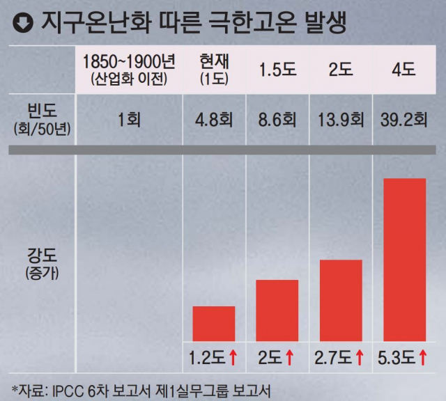 4. 온난화의 영향은 파괴적이다 지구온난화는 0.5도 상승만으로도 폭염, 집중호우, 가뭄과 같은 극한 기후현상의 빈도와 강도를 두드러지게 증가시킨다. 극한고온 전망을 보면 산업화 이전에는 50년에 한 번 발생했던 수준의 폭염이 지금 수준인 1도 온난화라면 같은 기간에 4.8차례 발생하고 최고 온도도 1.2도 더 오른다. 올 여름 터키, 그리스에 산불 대란을 불러온 50도에 육박하는 폭염이 예견된 재앙이라는 의미다. 1.5도 온난화라면 8.1차례, 2도 상승, 2도 온난화라면 13.9차례, 2.7도 상승으로 더 치솟는다. 강수도 마찬가지다. 온난화가 1도 증가할 때마다 전세계 일일 강수 극한현상은 7% 강화되고, 태풍 같은 열대 저기압도 강도와 풍속이 증가한다.