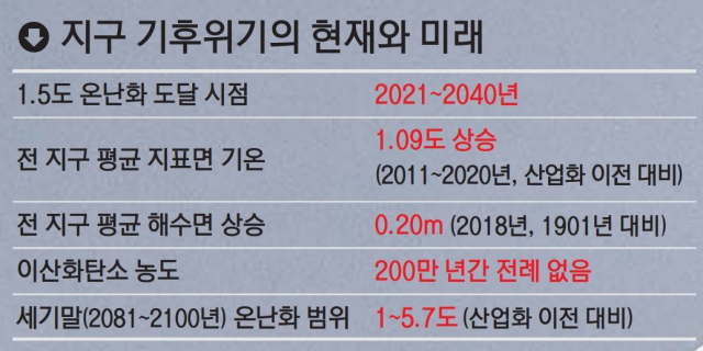 3. 2040년 전에 마지노선 넘는다 이번 보고서의 핵심은 2021~2040년 중에 1.5도 지구온난화를 넘어설 것이라는 전망이다. 해당 장의 총괄주저자인 부산대 이준이 교수는 기상청 브리핑에서 “온실가스 배출 시나리오에 상관 없이 2040년 이전에 1.5도 온난화에 도달할 가능성이 높다”고 강조했다. 가장 강력한 온실가스 배출 시나리오를 적용하면 이번 세기 말에는 1.5도 이하로 다시 돌아올 수 있겠지만, 탄소중립을 이루기 전까지 지구 온도는 계속 상승할 수밖에 없기 때문에 2030년대 중·후반이면 1.5도를 넘을 것이라는 평가다. 이 시점은 2018년 ‘지구온난화 1.5도’ 특별보고서에서 제시한 것(2030~2052년)보다 10년 이상 앞당겨진 것이다.