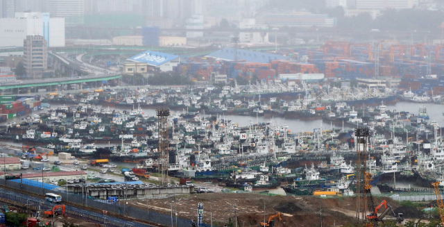 제12호 태풍 ‘오마이스’가 북상 중인 23일 부산 동구 부산항 5부두에 미리 대피한 선박들이 가득 들어차 있다. 기상예보에 따르면 태풍의 영향으로 남해안을 중심으로 강수량이 100~300mm까지 내릴 것으로 예상된다. 김경현 기자 view@