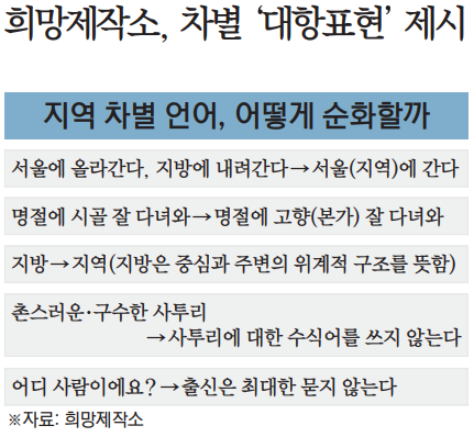 그러나 차별언어의 과잉적 규정이 반발을 낳고 또 다른 혐오를 야기할 수 있다는 지적도 있다. 희망제작소 유다인 연구원은 “지역 차별언어에 대한 대안을 제시하되, 다양한 지적과 조언을 다각도로 반영할 것”이라며 “다음 달 프로젝트 결과물을 담은 핸드북을 출간할 예정”이라고 밝혔다.