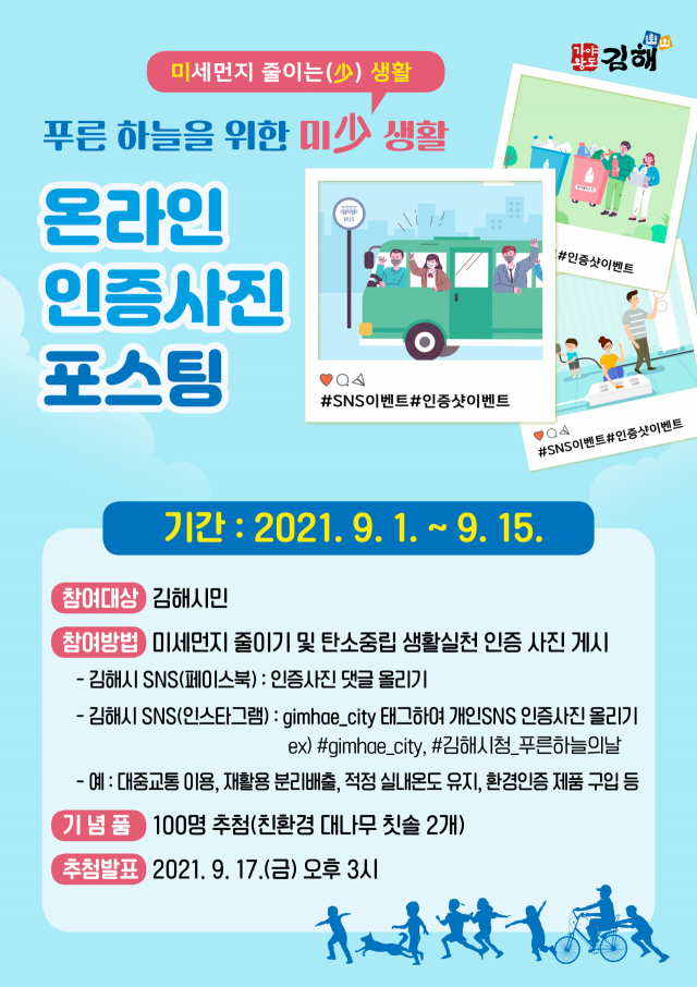 온라인으로 진행되는 ‘푸른 하늘을 위한 미少 생활 인증사진 올리기’는 대중교통 이용하기, 재활용품 분리배출, 친환경 인증제품 구입 등 미세먼지를 줄이는 생활 실천 인증사진을 페이스북 댓글달기 또는 김해시 계정을 태그해 인스타그램에 사진을 올리는 방식이며 인증사진을 게시한 참여자 100명에게 추첨을 통해 친환경 생활을 위한 기념품을 증정할 예정이다.