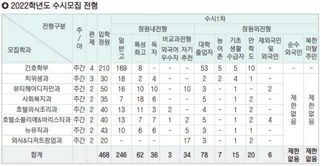 대동대는 간호학부 등 총 8개 학과로 구성됐으며, 2022학년도 정원 468명 중 수시모집에서 약 93.2%인 436명을 선발한다. 2022학년도 신입생 모집 때 뉴뮤직과는 실기고사 성적을 80% 반영하고 나머지 학과의 면접고사 반영 비율은 30%(간호학부의 경우 20%)다. 간호학부의 수시모집 정원내 전형(일반고전형, 특성화고전형)의 경우 지원자 중 선발 인원의 5배수까지 교과성적 80%, 출석성적 20%로 1차 선발한 뒤 면접고사를 실시한다. 2022학년도 신설학과인 치위생과의 일반고전형, 특성화고전형은 면접고사를 실시하지 않으니 면접평가에 대한 부담을 덜 수 있다.