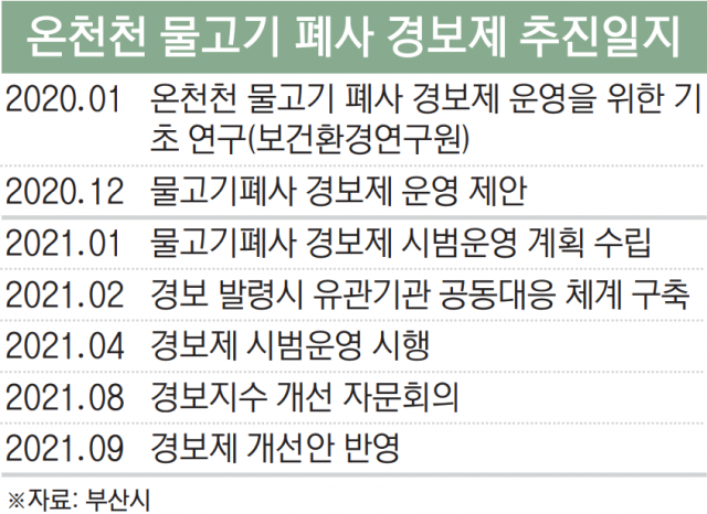 부산시의 이번 대책은 지난 4월 온천천 폐사 경보제 시범도입 이후 2차례에 걸친 물고기 폐사에도 경보가 울리지 않아 경보제 개선이 필요하다는 지적에 따라 마련됐다. 지난 7월과 8월 온천천에서는 1000마리가 넘는 물고기 떼죽음이 발생했지만 당시 경보지수는 주의보 발령(20)에도 못 미치는 수치(15)를 기록했다. 이에 따라 부산시는 지난달 5일 전문가 자문회의를 개최하는 등 경보제 개선방안을 고민해 왔다.