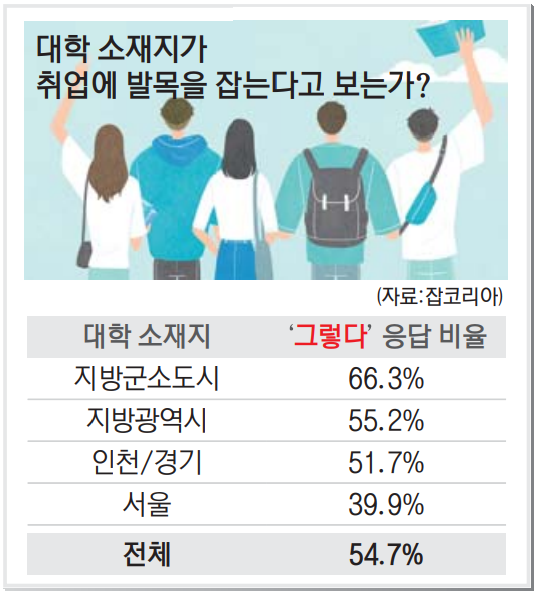 “지방대 출신인데 되게 노력하셨나 보네요” 지난 2월 대기업에 입사한 부산의 한 국립대 출신 강 모(34) 씨는 입사 동기로부터 이런 말을 들었다. 강 씨가 기분 나빠하자, 동기는 “대학은 능력 순으로 가는 것 아니겠냐”며 “인프라까지 취약한 지방대에서 취직에 성공했다는 걸 감안해 칭찬으로 한 이야기”라고 되받아쳤다.