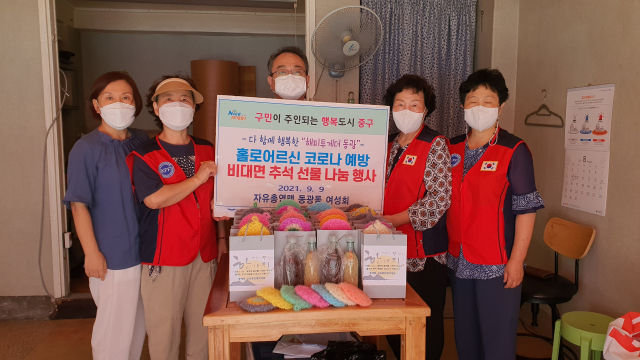부산 중구 동광동 자유총연맹 여성회(회장 김순옥)는 추석 명절을 맞이하여 홀로 거주하고 있는 저소득가구 30세대에게 추석 명절 성품으로 참기름‧깨소금 세트와 수세미를 전달하였다.