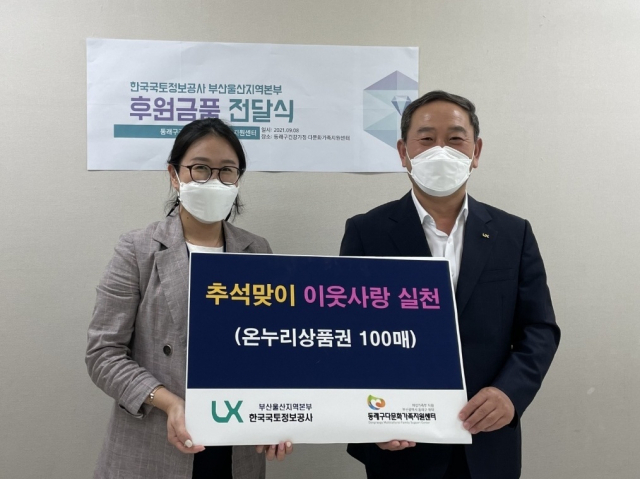 한국국토정보공사(LX) 부산울산지역본부(본부장 윤한필)는 지난 8일 추석을 맞아 동래구다문화가족지원센터(센터장 곽명희)에 온누리상품권을 전달했다.