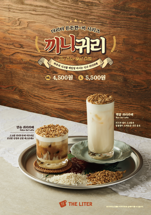 커피 프랜차이즈 더리터는 귀리를 이용한 ‘든든한끼 끼니귀리 라떼 시리즈’인 ‘연유 귀리라떼’와 ‘햇쌀 귀리라떼’를 출시한다고 17일 밝혔다.