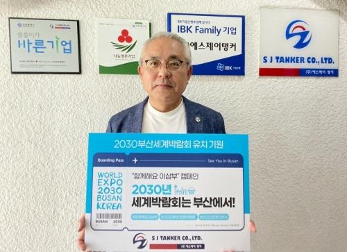 박성진 한국유조선사협회 회장(에스제이탱커 대표)이 지난 24일 2030부산세계박람회 범국민 응원 캠페인 ‘함께해요 이삼부(2030년은 부산에서)’에 동참했다.