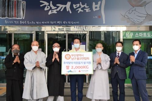 남구불교연합회(회장 지원 스님)와 사회복지법인 문수복지재단(대표이사 지원 스님)은 최근 부산 남구청(구청장 박재범·가운데)을 방문해 이웃을 위해 써 달라며 쌀 3200kg을 기탁했다.