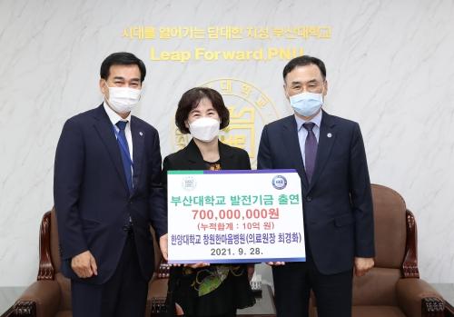 부산대학교(총장 차정인·오른쪽)는 하충식(왼쪽) 한양대학교 창원한마음병원 이사장과 최경화(가운데) 의료원장 동문 부부가 28일 대학본관 5층 총장실을 찾아 부산대에 장학금 및 발전기금 7억 원을 기탁했다고 밝혔다.