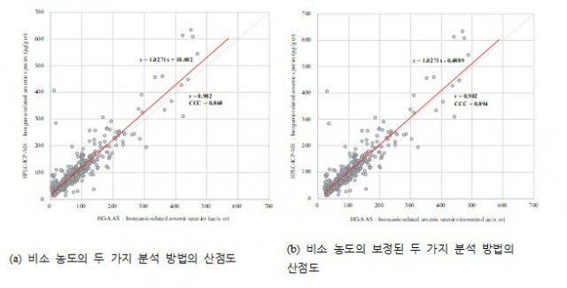 센터는 ‘수소화물 발생법-원자흡수 분광계(hydride generation atomic absorption spectroscopy)’를 이용해 4개 비소 화학종 총합의 농도(hAsAAS) 지표를, ‘액체크로마토그래피와 결합된 유도결합플라즈마(high performance liquid chromatography with inductively coupled plasma mass spectrometer)’를 이용해 개별 비소 화학종과 총합 농도(hAsICP) 수준을 동시에 평가했다.