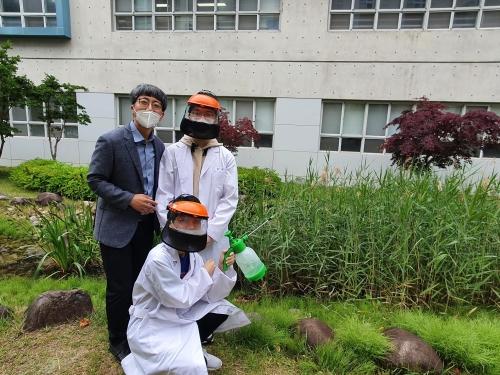 부산 금정구 부산과학고 ‘해충박멸CESCO’팀(1학년 김민준, 하승훈, 지도교사 황종률(왼쪽))이 최근 ‘제18회 화학탐구프런티어페스티벌’에서 대상(국무총리 표창)’을 수상했다. 이 팀은 ‘루미놀 반응을 이용한 모기 발광’을 주제로 시판되는 살충제를 사용하지 않고 유인물질과 루미놀로 모기를 발광시켜 퇴치하는 방법을 고안했다. 임원철 선임기자