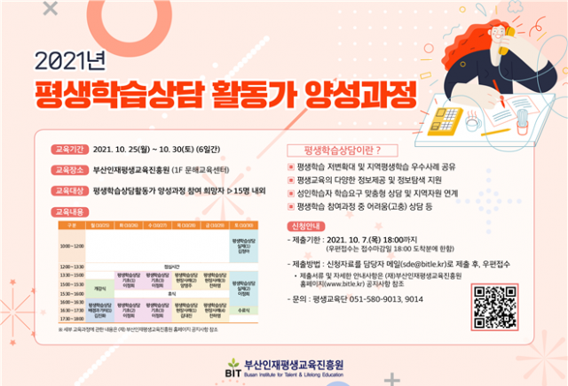 (재)부산인재평생교육진흥원(원장 설상철)은 부산시민의 평생학습 참여율을 높이고 평생교육의 다양한 정보를 제공하기 위해 ‘2021년 평생학습상담활동가 양성과정’을 10월 25일(월)부터 일주일간 운영한다고 밝혔다.