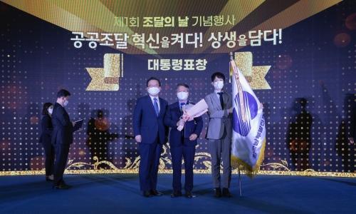 한국남부발전(사장 이승우·가운데)은 지난달 30일 정부 세종컨벤션센터에서 열린 ‘2021년 혁신지향 공공조달 유공 정부포상’ 시상식에서 대통령 표창을 받았다.