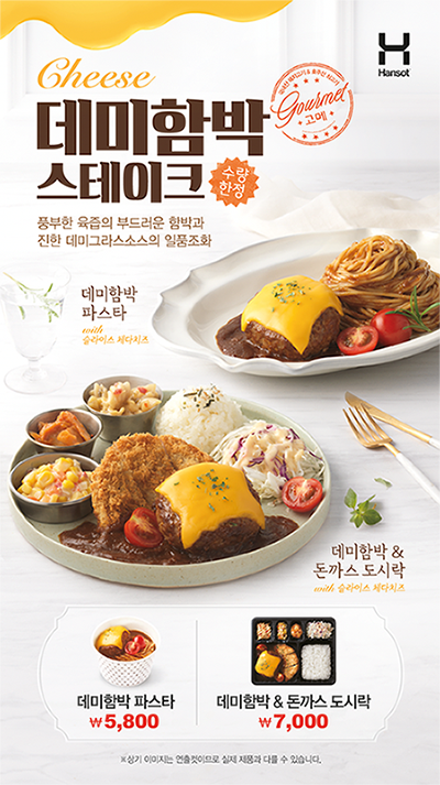 △도시락 프랜차이즈 한솥이 10월 신메뉴 데미함박 스테이크 도시락을 출시한다. 2016년 가을 출시해 히트상품으로 등극한 '데미그라스 함박스테이크'를 리뉴얼한 메뉴다. '데미함박 파스타'와 '데미함박&돈까스' 2종으로 구성했다. 데미함박 스테이크는 기존보다 양파 함량을 더욱 높여 촉촉하고 부드러운 맛을 향상시켰다. 호주산 소고기와 국내산 돼지고기를 사용해 부드러운 식감과 함께 풍부한 육즙을 느낄 수 있다. 특제 데미그라스 소스는 토마토 페이스트 함량을 높여 느끼한 맛을 잡아주며 더욱 깊고 진해진 풍미가 특징이다. 슬라이스 체다치즈 토핑을 얹어 고소함을 더했다. 데미함박 파스타는 데미함박 스테이크에 우수한 품질이 검증된 터키산 스파게티 면을 더해 간편한 한끼 식사로 손색 없는 메뉴다. 부드러운 함박 스테이크와 파스타, 데미그라스 소스가 어우러져 조화롭게 입에 착 감기는 풍미를 느낄 수 있다. 데미함박&돈까스는 데미함박 스테이크에 바삭한 돈까스와 따끈한 밥, 샐러드까지 추가한 든든한 구성으로 푸짐한 한 끼를 맛볼 수 있다.