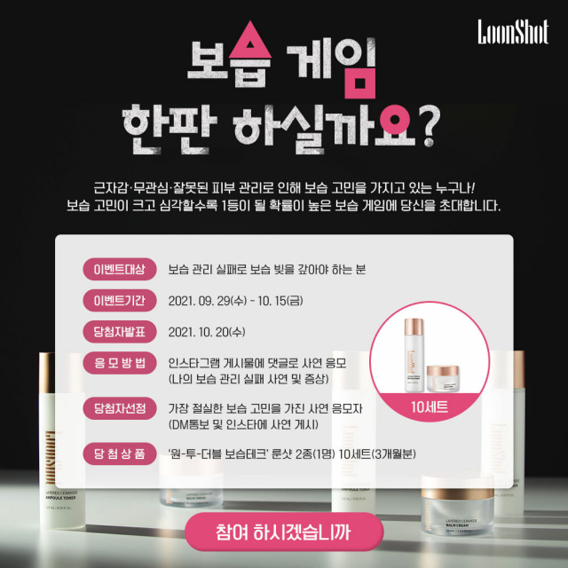 △크레이지 뷰티 레시피 브랜드 룬샷이 '보습게임 이벤트'를 진행한다. 오는 15일까지 보습 관련 피부고민에 대한 사연을 인스타그램을 통해 응모하는 고객을 대상으로 '원 투 더블 보습테크' 제품 2종을 추첨을 통해 제공한다. 이번 행사는 무관심, 잘못된 피부관리로 인해 보습 고민을 가지고 있는 누구나 참여할 수 있다. 자세한 내용은 공식 홈페이지에서 확인할 수 있다.