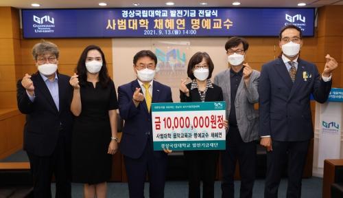 채혜연 경상국립대 음악교육과 명예교수가 최근 가좌캠퍼스 본관 3층 접견실에서 경상국립대 사범대학 연구와 학술 발전에 보태라며 대학발전기금 1000만 원을 출연했다.