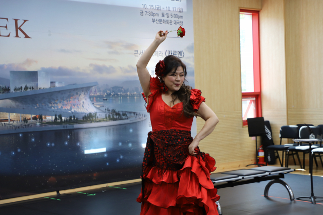 영화의전당에서 선보이는 콘서트 오페라 ‘카르멘’에서 ‘카르멘’ 역할을 맡은 메조소프라노 양송미가 1일 쇼케이스 무대에서 아리아를 부르고 있다. 부산문화회관 제공