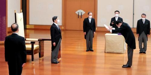 기시다 후미오(오른쪽) 일본 신임 총리가 4일 도쿄 왕궁에서 나루히토(왼쪽) 일왕으로부터 임명장을 받는 친임식을 치르고 있다. 왼쪽 두 번째는 스가 요시히데 전 총리. AFP연합뉴스기시다 후미오 신임 일본 총리가 5일 조 바이든 미국 대통령과 첫 전화 통화를 하는 것으로 본격적인 외교 활동에 시동을 걸었다.