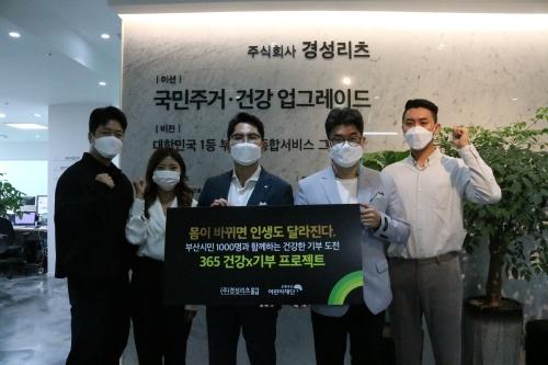 ㈜경성리츠(대표이사 채창일·가운데)는 지난달 29일 ‘제7차 건강프로젝트 365 건강&기부 올집 프로젝트’를 런칭하고 초록우산 어린이재단(부산지역본부장 노희헌·왼쪽 네 번째)에 기부금 지원을 약속하는 기부약정식을 가졌다.