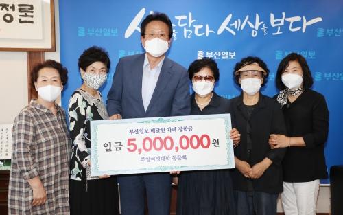 부일여성대학 동문회 제38대 회장단(회장 남춘숙·왼쪽 네 번째)은 5일 부산일보 배달원 자녀를 위한 장학금 500만 원을 김진수(왼쪽 세 번째) 부산일보 대표이사 사장에게 전달했다.