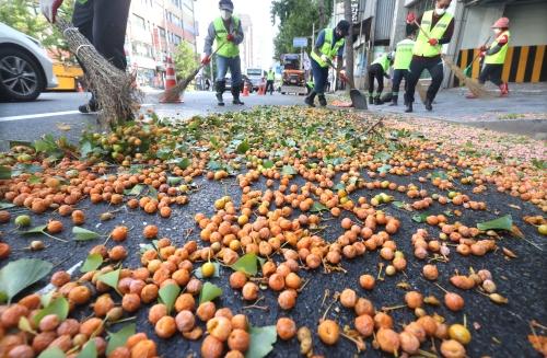 부산 부산진구청 관계자들이 5일 범천동 도로에서 은행을 따고 있다. 수확된 은행은 중금속 검사 등을 한 후 복지시설 등에 기증할 예정이다. 강선배 기자 ksun@
